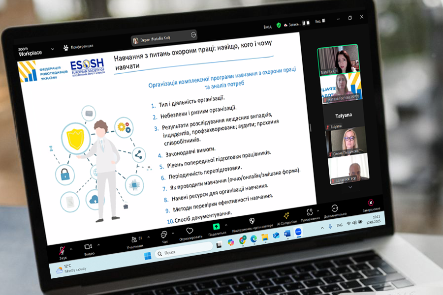 12 червня відбувся черговий вебінар зі серії 12-ти запланованих у цьому році вебінарів у сфері безпеки та здоров’я працівників на роботі, які направлені на підвищення рівня обізнаності та поінформованості фахівців у сфері охорони праці у т.ч. щодо майбутньої імплементації положень Директиви Ради від 12 червня 1989 року про запровадження заходів, покликаних заохочувати до покращення безпеки та охорони здоров'я працівників на роботі (89/391/ЄЕС).